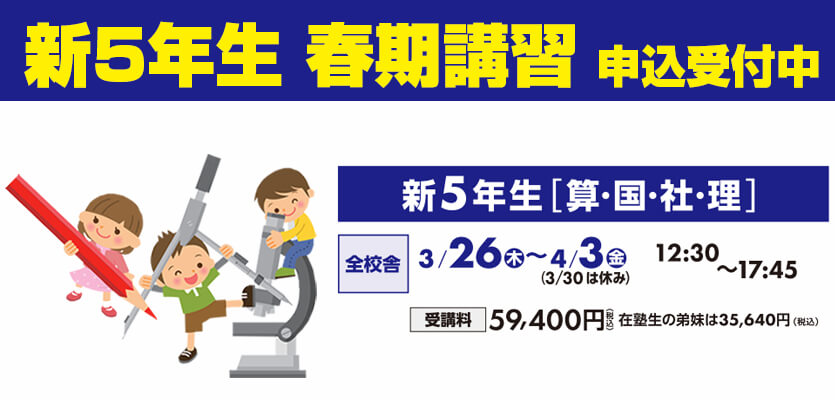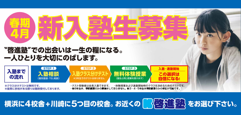 2025年11月19日 / 最終更新日 : 2026年1月17日 啓進塾 お知らせ 新3年生(現2年) 入塾説明会開催! 啓進塾では、新3年生(現2年)のお子さまを対象に 入塾説明会を開催いたします。 中学受験に向けて、いつから・何を・どう始めるべきか── 初めての方にもわかりやすくご説明いたします。 ぜひこの機会に、啓進塾の学びを知ってく […]